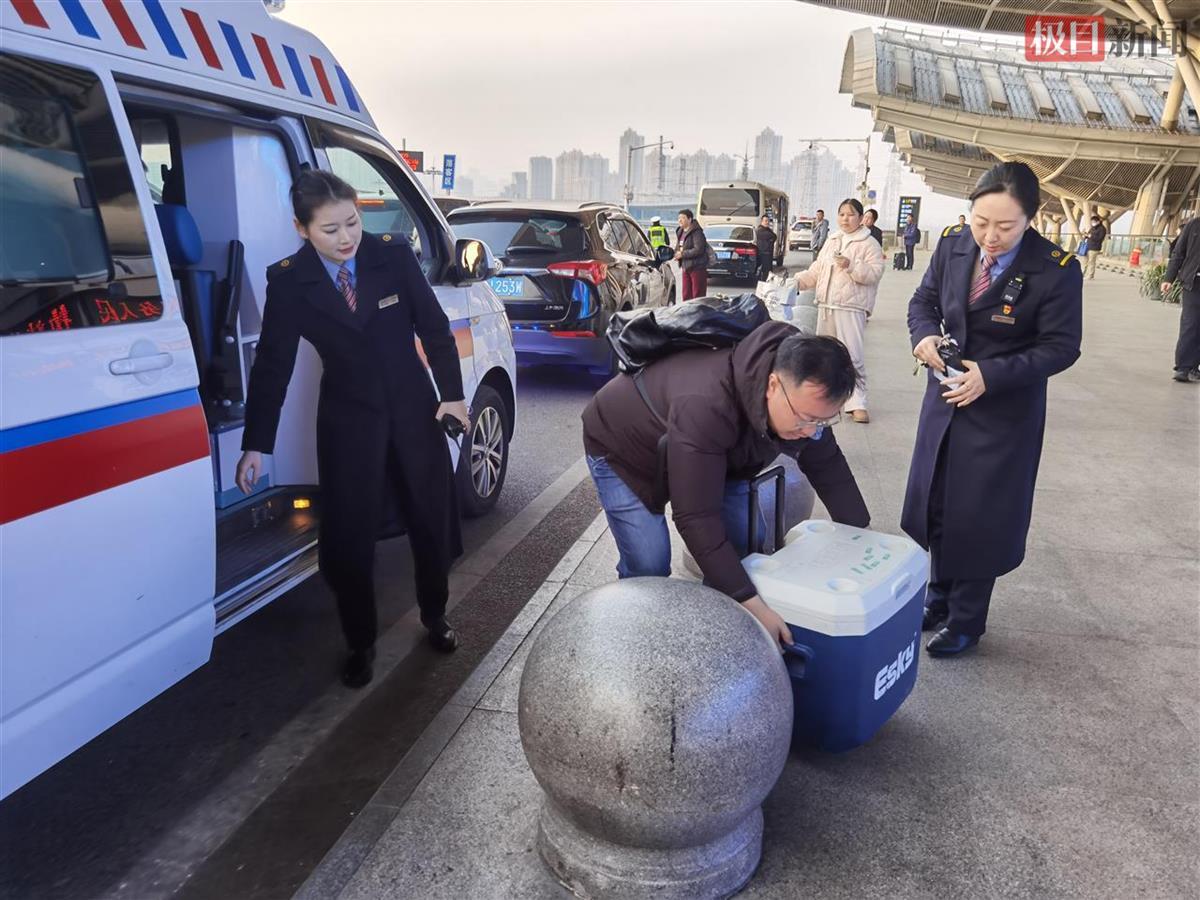 “快,跟我们走!”在张晓芳、苏弯的引导下,李医生健步如飞,由绿色通道快速出站。16:46,李医生携带的盛放供体的医用转运箱,已安全送上120救护车,全程仅用时3分钟。