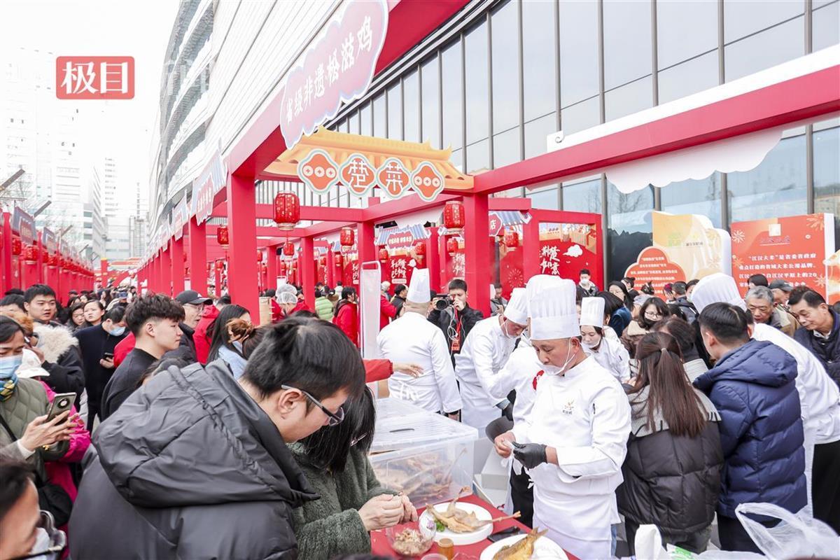 极目新闻记者在国潮好物市集看到,德华楼三鲜豆皮、襄阳牛肉面、恩施炕土豆等特色楚菜小吃飘香四溢;扬子江、老万成、熊银匠等老字号荆楚好物应有尽有;非遗剪纸、汉绣、楚简等非遗技艺现场展示……吸引众多消费者前来打卡。