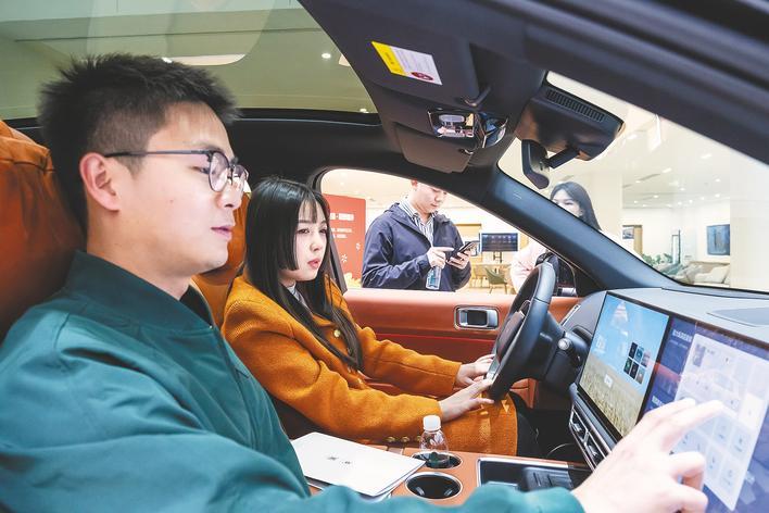 1月21日,在武汉市江岸区黄浦科技园理想汽车零售中心,市民在门店内体验新能源车。 (湖北日报全媒记者 任勇 摄)