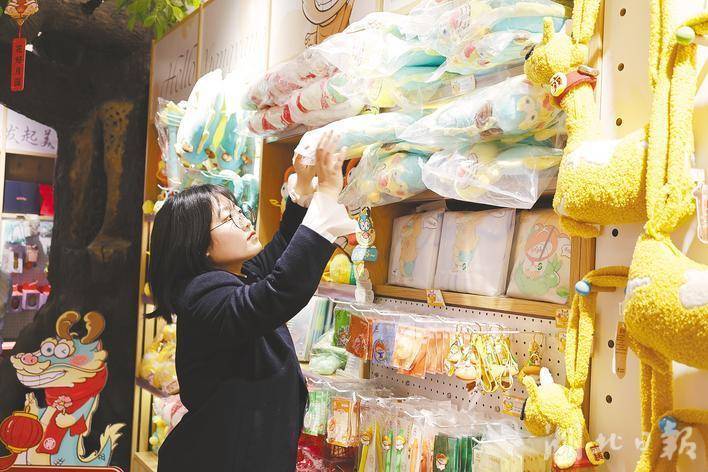 1月20日,张梦琦在“襄阳礼物”文创产品店整理货品。(湖北日报全媒体记者 汪璐 通讯员 刘蒂尼 摄)