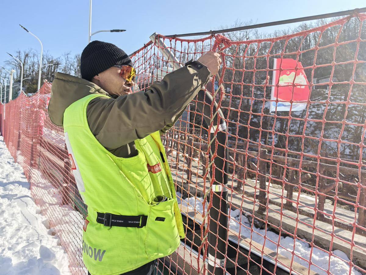 马俊在检查滑雪场的防滑网。(湖北日报全媒记者 雷闯 周升蕾 通讯员 刘自爽 摄)