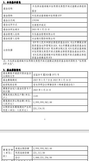 募集期间净认购金额2,999,999,983.00元,认购资金在募集期间产生的利息221,534.91元,募集份额合计3,000,221,296.00份。