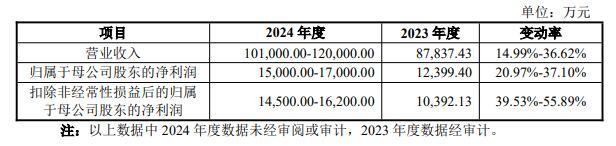 兴福电子2024年全年预计实现营业收入10.10亿元至12.00亿元,较2023年同期预计变动幅度为14.99%至36.62%;预计实现归属于母公司股东的净利润1.5亿元至1.7亿元,较2023年同期预计变动幅度为20.97%至37.10%;预计实现扣除非经常性损益后的归属于母公司股东的净利润为1.45亿元至1.62亿元,较2023年同期预计变动幅度为39.53%至55.89%。