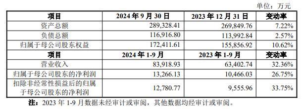 2024年1-9月,兴福电子营业收入为83,918.93万元,同比增长32.36%;归属于母公司股东的净利润13,266.13万元,同比增长26.75%;扣除非经常性损益后的归属于母公司股东的净利润12,780.77万元,同比增长33.75%。