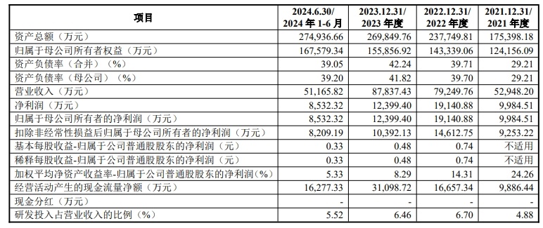 2021年、2022年、2023年、2024年1-6月,兴福电子实现营业收入分别为52,948.20万元、79,249.76万元、87,837.43万元、51,165.82万元;归属于母公司所有者的净利润分别为9,984.51万元、19,140.88万元、12,399.40万元、8,532.32万元;扣除非经常性损益后归属于母公司所有者的净利润分别为9,253.22万元、14,612.75万元、10,392.13万元、8,209.19万元;经营活动产生的现金流量净额分别为9,886.44万元、16,657.34万元、31,098.72万元、16,277.33万元。