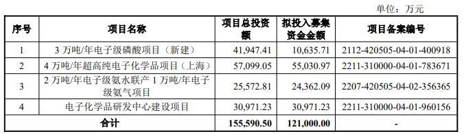 兴福电子2025年1月17日发布的首次公开发行股票并在科创板上市招股说明书显示,公司拟募集资金121,000.00万元,用于3万吨/年电子级磷酸项目(新建)、4万吨/年超高纯电子化学品项目(上海)、2万吨/年电子级氨水联产1万吨/年电子级氨气项目、电子化学品研发中心建设项目。