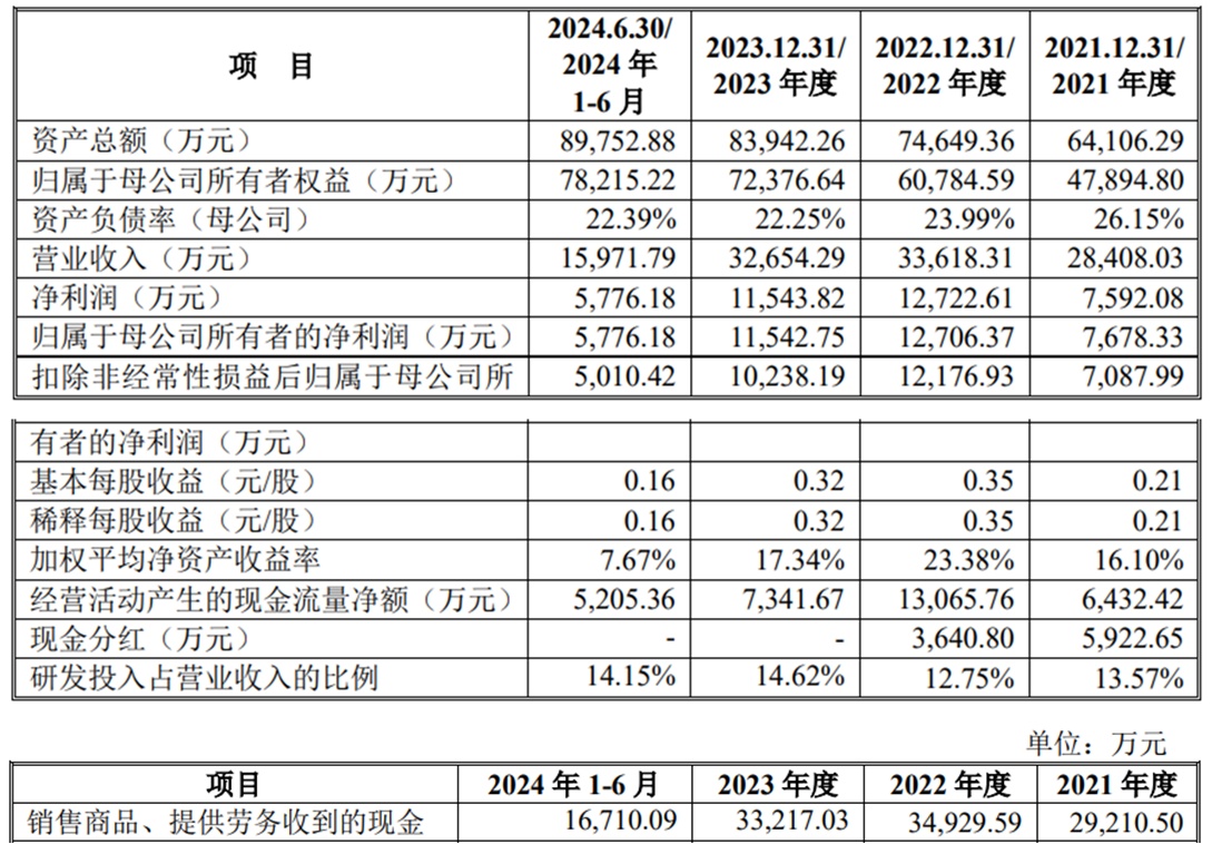 2021年至2024年1-6月,超研股份的营业收入分别为28,408.03万元、33,618.31万元、32,654.29万元和15,971.79万元;净利润分别为7,592.08万元、12,722.61万元、11,543.82万元和5,776.18万元;归属于母公司所有者的净利润分别为7,678.33万元、12,706.37万元、11,542.75万元和5,776.18万元;扣除非经常性损益后归属于母公司所有者的净利润分别为7,087.99万元、12,176.93万元、10,238.19万元和5,010.42万元。