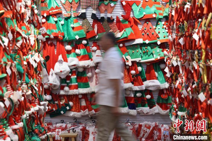 近日,一名采购商从浙江义乌市场的圣诞帽档口走过。董易鑫 摄