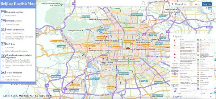 北京市英文地图包括电子地图和纸质地图。电子地图涵盖行政区划、自然地物、交通运输、管理机构、国际组织、教育文化、医疗卫生、运动休闲、居民住宿、商业设施等类别,共计3万余条注记。为便于外籍人士使用,梳理提炼外籍人士对英文地图的高频需求,增设6类专题图,包括外汇指定银行网点、SIM卡(用户身份识别卡)办理、交通卡办理、证件办理、自驾服务、景区服务等4000余条专题注记,为外籍人士来京旅游、工作和生活提供便利的查询定位服务。英文地图数据将向政府有关门户网站、地图服务平台、第三方城市生活服务平台共享,提供更多服务场景。