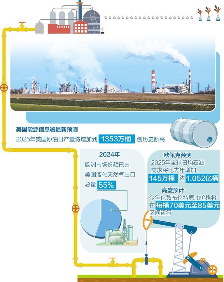 美国液化天然气出口前景可观。美国在短短几年内就成为全球最大的液化天然气出口国,也是欧洲最大的天然气供应国。欧盟委员会发布的数据显示,2023年欧盟从美国进口的液化天然气占其进口总量的46%,较2021年增长近1倍。到2024年,欧洲市场份额已占美国液化天然气出口总量的55%。即使如此,美国仍在敦促欧盟加大从美国购买原油和液化天然气的力度。