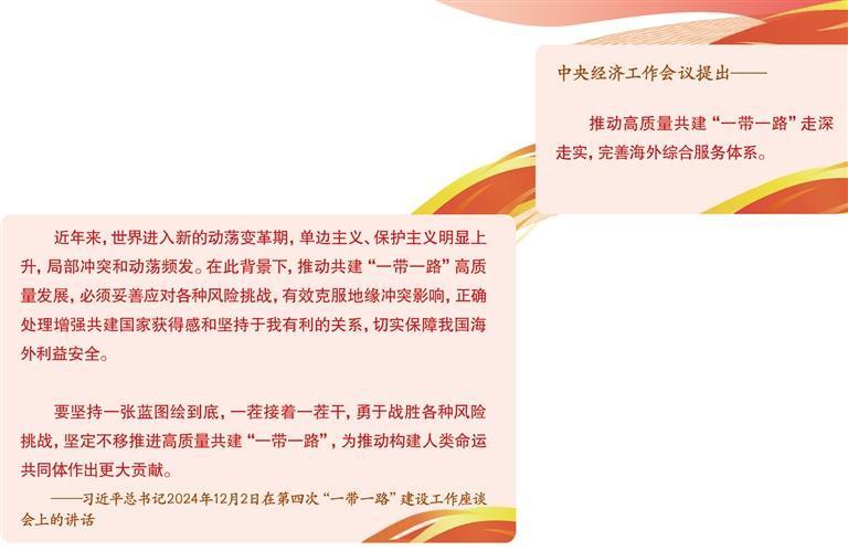 共建“一带一路”从中国倡议走向国际实践,从理念转化为行动,已进入高质量发展新阶段。2024年12月召开的中央经济工作会议明确了2025年要抓好的重点任务,包括“扩大高水平对外开放,稳外贸、稳外资”,其中一项具体工作是“推动高质量共建‘一带一路’走深走实,完善海外综合服务体系”。此前,习近平总书记在第四次“一带一路”建设工作座谈会上强调,“推动共建‘一带一路’高质量发展机遇和挑战并存,但总体上机遇大于挑战”。面对当前严峻复杂的国际环境,需总结成绩和经验、分析研究新形势,以创新思维和扎实行动,坚定不移推进高质量共建“一带一路”。