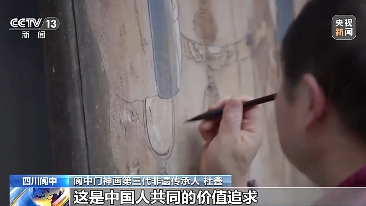 阆中门神画第三代非遗传承人 杜鑫:门神画一代代传承到现在,它充满了生命力,是因为它蕴含着人们对平安幸福和美好生活的向往,是中国人共同的价值追求。