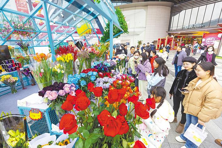 1月22日,市民在武汉武商梦时代国潮好物市集选购鲜花。“年在荆楚 巳巳如意”湖北新春消费季活动正在火热进行,在武商梦时代广场,汉口北国际贸易城搭设约40平方米的鲜花礼盒造型展台,吸引众多市民参观选购。 (湖北日报全媒记者 柯皓 摄)