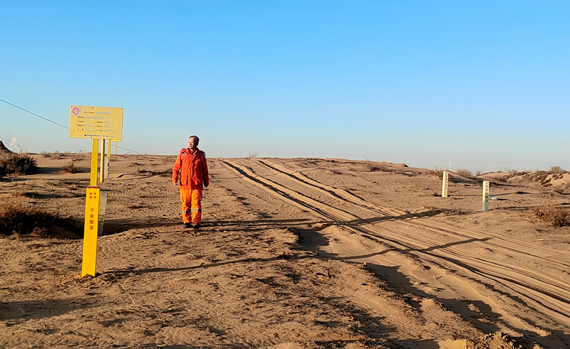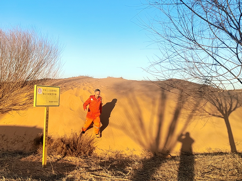 清理警示牌、给管道“号脉”是他的主要工作。这一段被当地人成为“五十里沙”,顾名思义方圆五十里都是沙地。每走一段,就要停下将鞋里的沙子清理干净。连续工作几个小时,浑身都早已冻透,冷风夹杂着沙粒不时打在脸上,生疼。