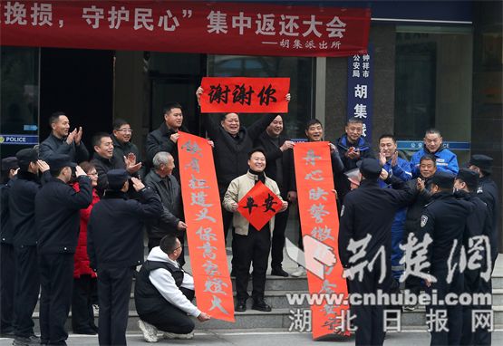 返还现场,受害群众们自发送来了一面面锦旗递交给民警,表示对公安机关快侦快破快还的感激之情,一名群众还自发写了一副对联向胡集派出所送上温暖的春节祝福。