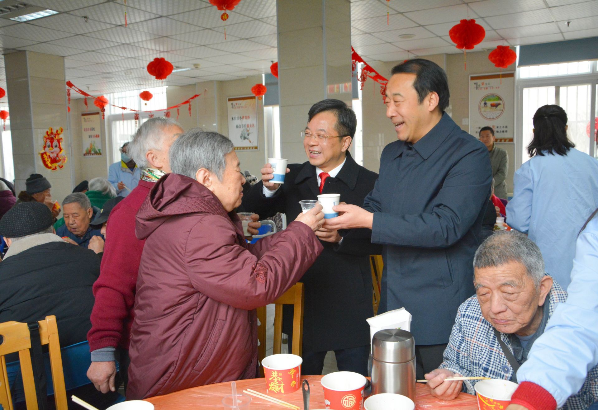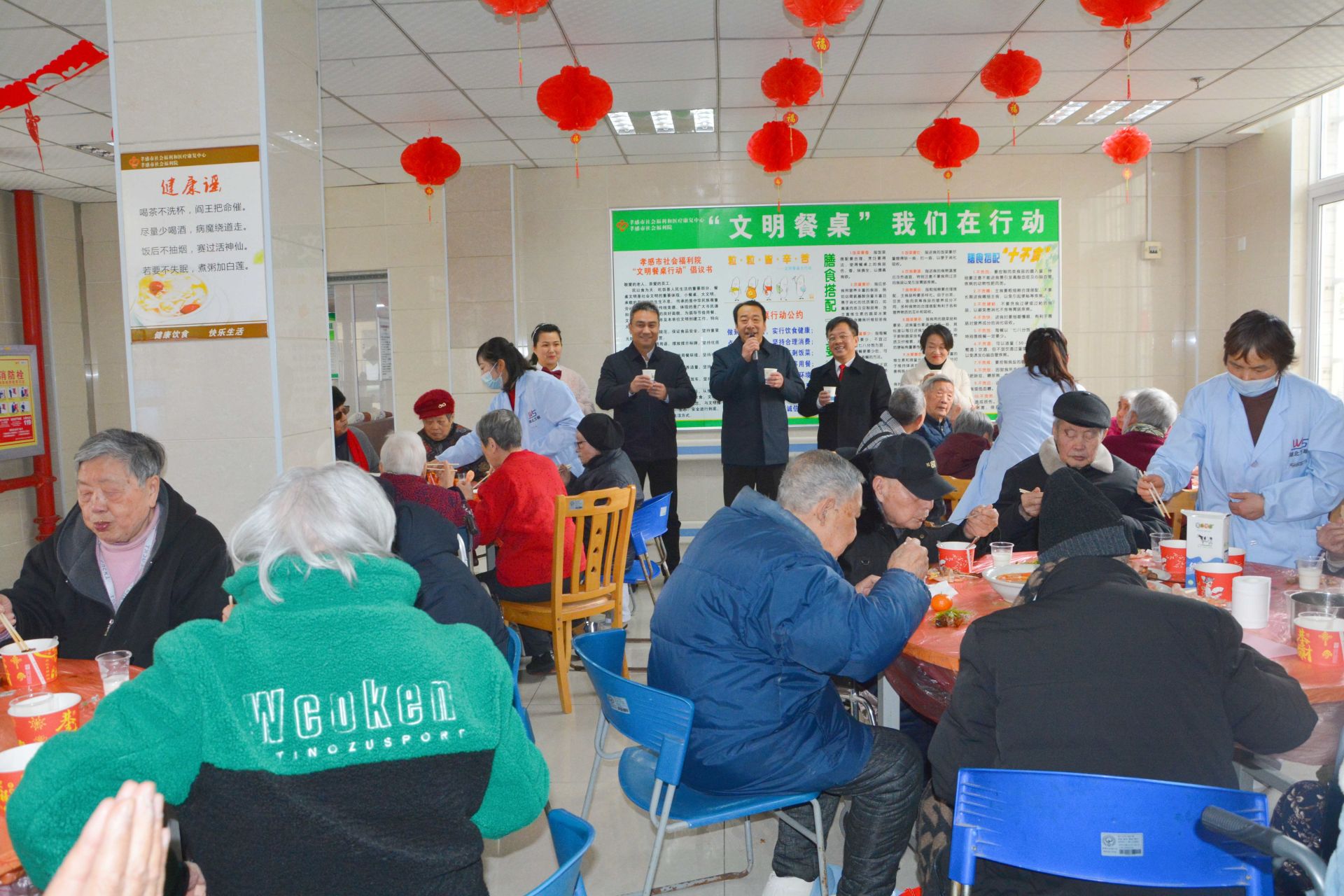 中午,为老人们精心准备的团年饭正式开始了,孝感市社会福利和医疗康复中心党委书记王志农、主任刘晓安、副主任兰博及相关行政职能科室负责人来到食堂餐厅,向老人们送上新年的祝福。