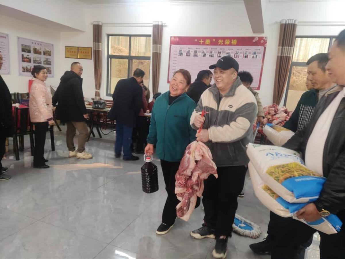 黄荆塘村八组组长熊荣华介绍,他们组从幸福合作社成立那年起就向村民进行分红,从最初的分肉开始,到现在分肉、分米、分油、分现金。这些年来,合作社的经营状况一年比一年好,村民的分红也一年比一年多。2024年幸福合作社经营的“四大产业”共盈利40余万元,在保留了部分以后的发展资金外,拿出23.8万元作为奖金分给全体村民。每户村民在得到不同金额分红的同时,还能分到土猪肉、大米和食用油。