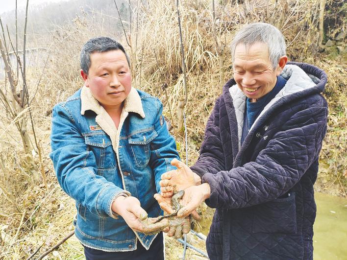 山间的子夜,寒风凛冽。刘玉桥熟练地拿出温度计,测量起溪坑的水温,而后用网兜在水中捞出两条成体娃娃鱼。