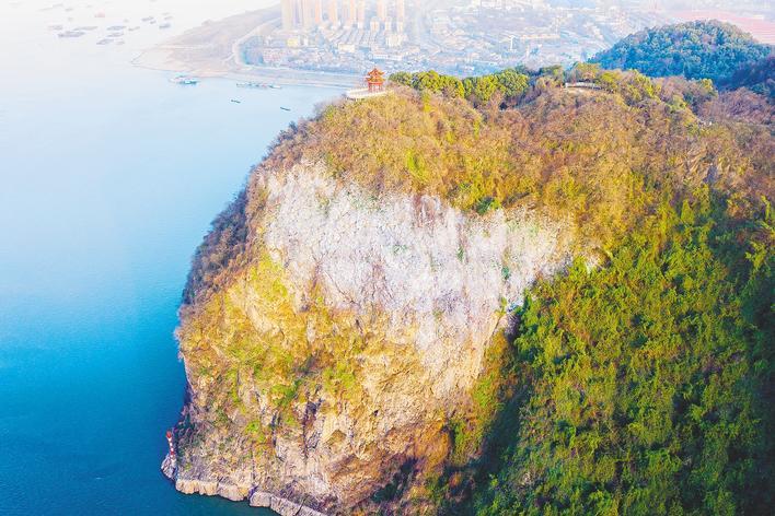 寒冬时节,黄石长江段,西塞山直耸江心,170多米高的临水崖壁犹如“残雪”,一幅诗画山水跃然眼前。(湖北日报全媒记者 薛婷 通讯员 周巍 摄)