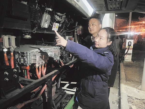 1月15日在天顺园公交场站,712路驾驶员彭曦及车队管理人员刘飞正在检查一辆公交车的电力系统