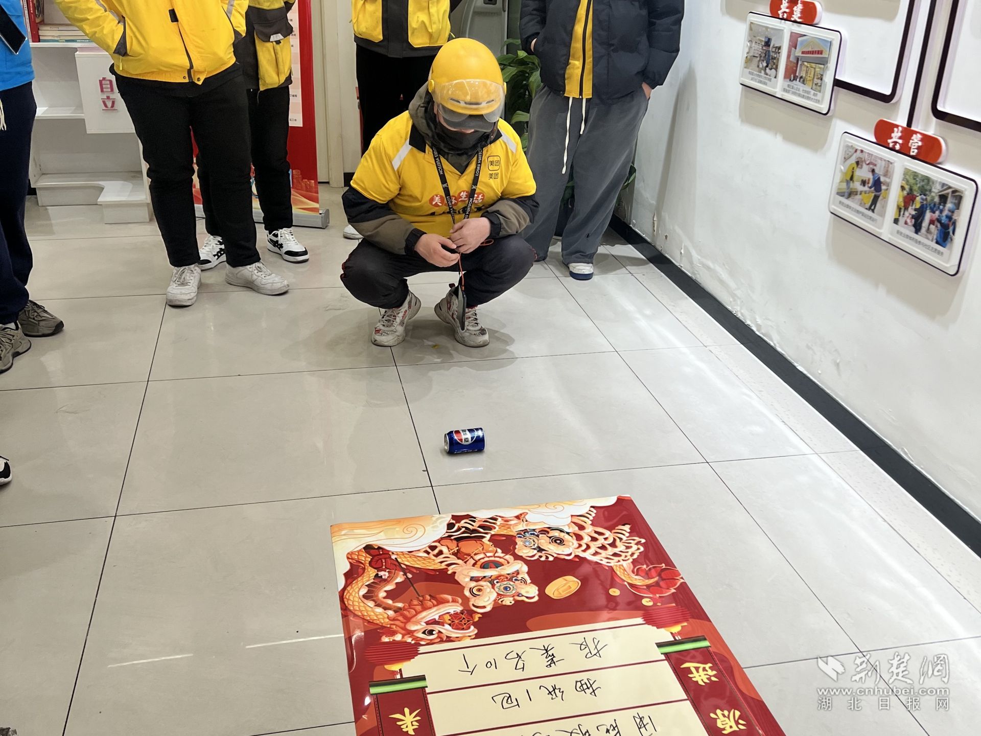 现场,书法志愿者挥毫泼墨,一幅幅寓意美好的春联和“福”字送到快递小哥、外卖小哥手中,为传统团圆饭增添了暖心祝福。同时,以防风围脖、洗手液、纸巾等生活用品为奖品的暖“新”大礼包互动游戏,将浓浓的年味、融融的情谊以及暖暖的关怀传递给了新就业群体,确保大家安心过好年。