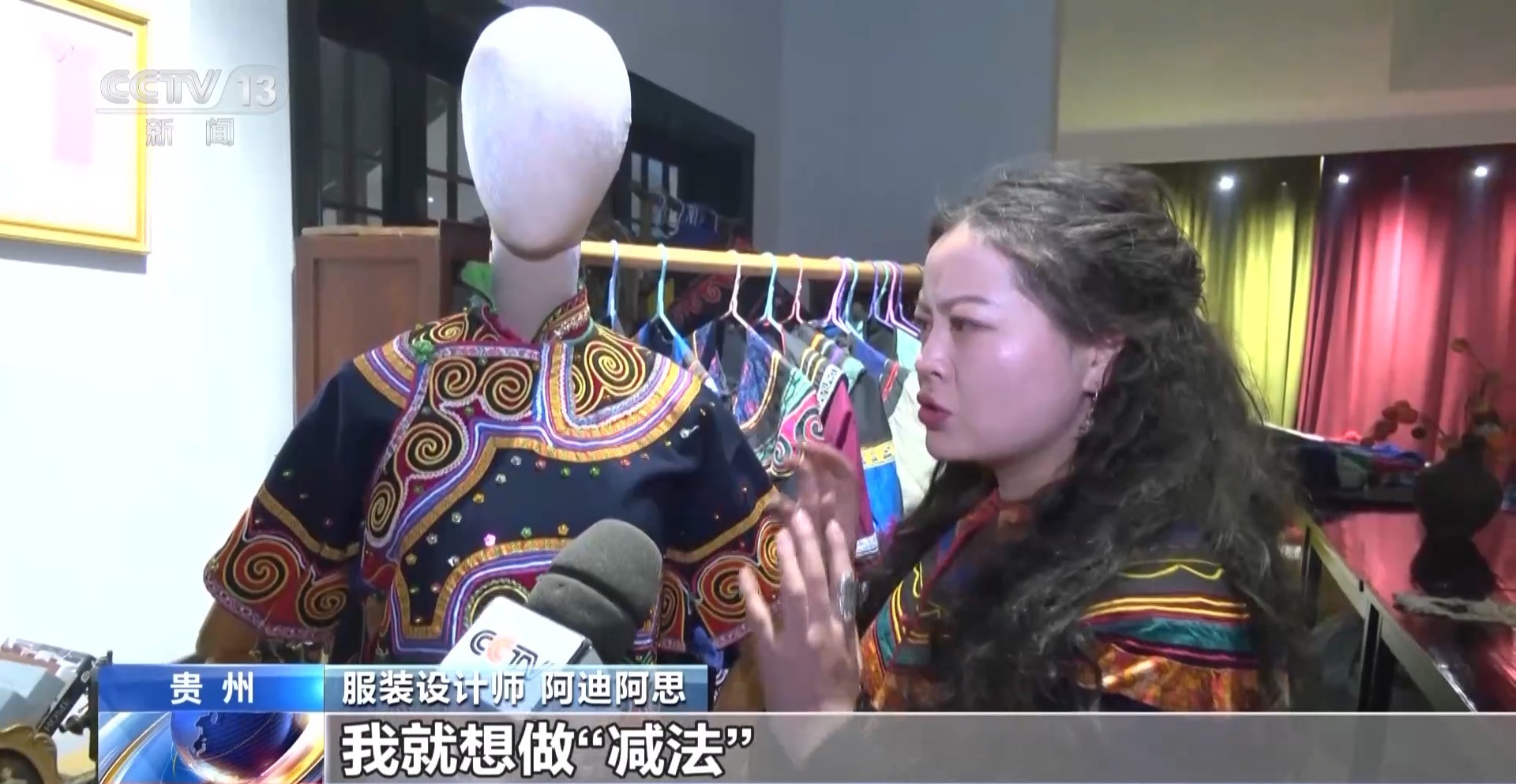 服装设计师 阿迪阿思:我们之前的彝族衣服就比较传统,比较盛装,就像这件衣服,全都是手工绣完成,工期就比较长,也比较复杂。我就想做“减法”,让衣服比较成衣,生活化,在改良的基础上都保留了彝族的传统元素。