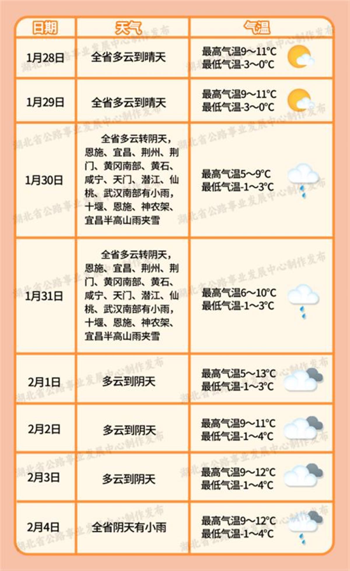 湖北省公路事业发展中心与湖北省气象服务中心研判,预计1月28日—2月4日,全省先晴后雨。其中,1月28日(除夕)至29日(初一),全省以多云到晴天气为主,气温缓慢回升;1月30日(初二)至31日(初三)全省多云转阴天,南部有小雨,半高山雨夹雪;2月4日(初七)阴天有小雨。