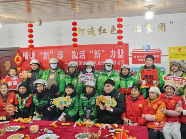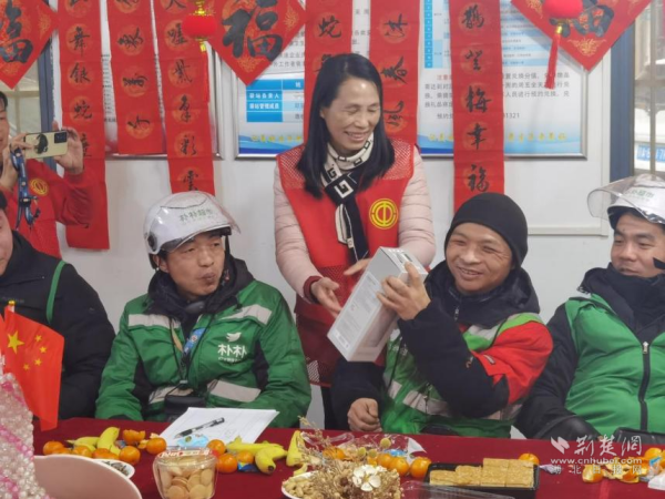 活动最后,工会小组成员为新就业群体送上春联套装。大家手持春联,共同合影留念,定格这一温暖瞬间。