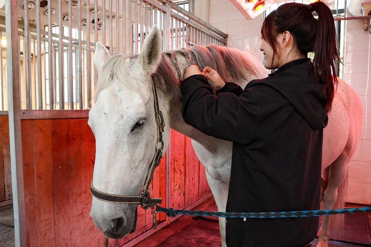 马房内,大二学生陈宇琦先用毛刷仔仔细细擦拭马身,再将鬃毛捋顺,最后用红丝绳给马儿编一个麻花辫。在同学们的精心打扮下,一匹匹马儿被打扮成了一个个充满年味的“福宝”。