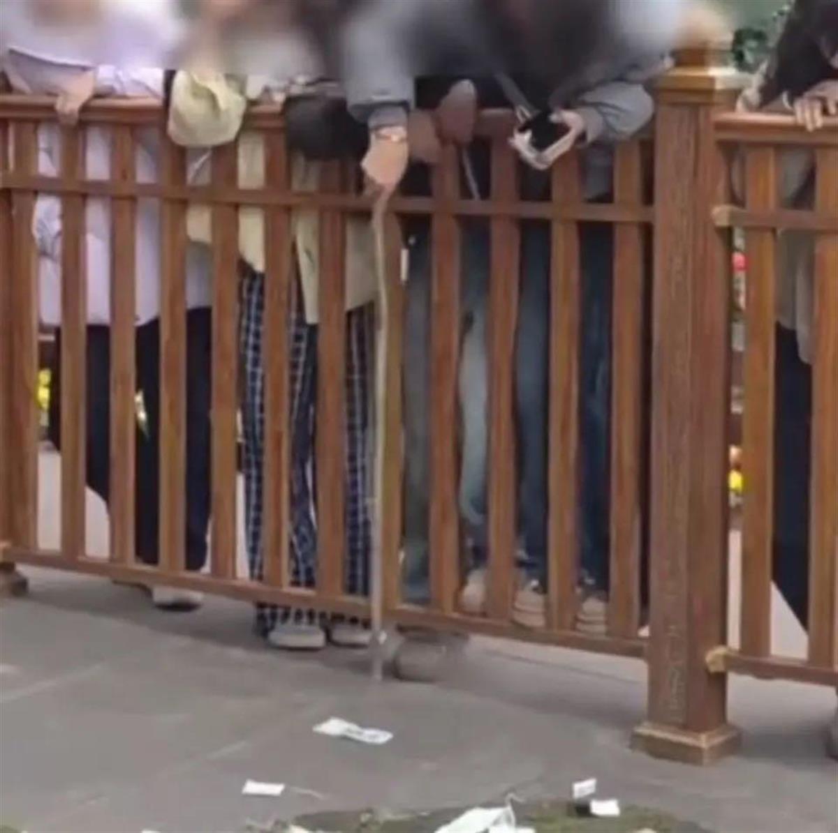网传视频显示,一人用棍子扒拉钱使之离围栏更近,另一人则蹲下捡钱,还有围观游客出声阻止,“有点不文明。”