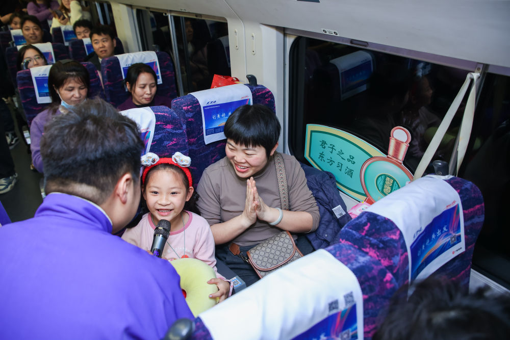 1月23日,工作人员在返乡务工专列上与乘客互动。新华社发