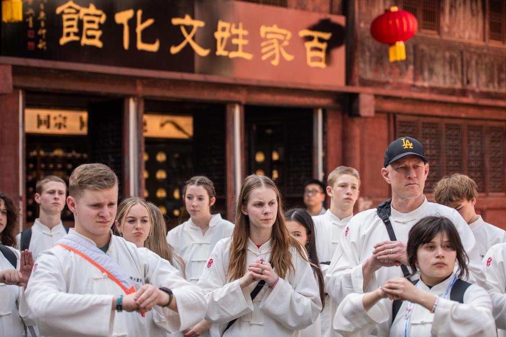 2024年3月22日,美国华盛顿州中学生代表团成员在武当山学习如何抱拳。新华社记者 伍志尊 摄