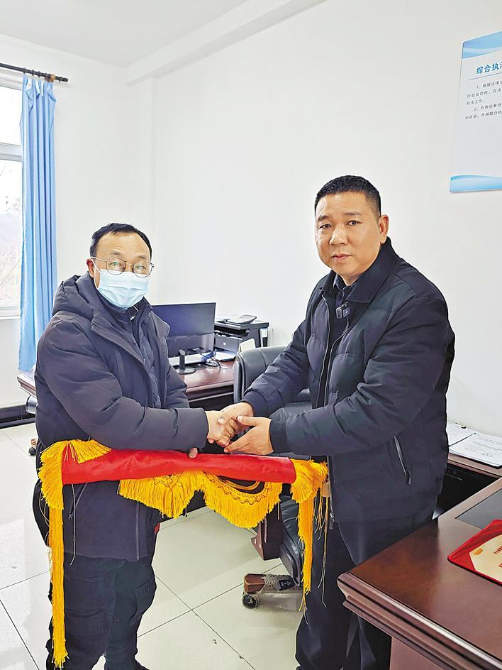 龙德发(左)给许雪峰送来锦旗。(湖北日报全媒记者 周泉 摄)