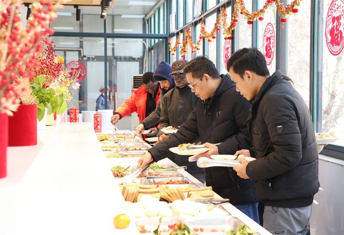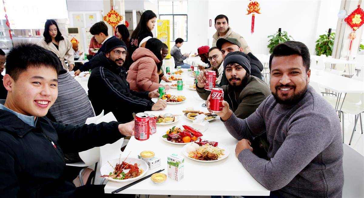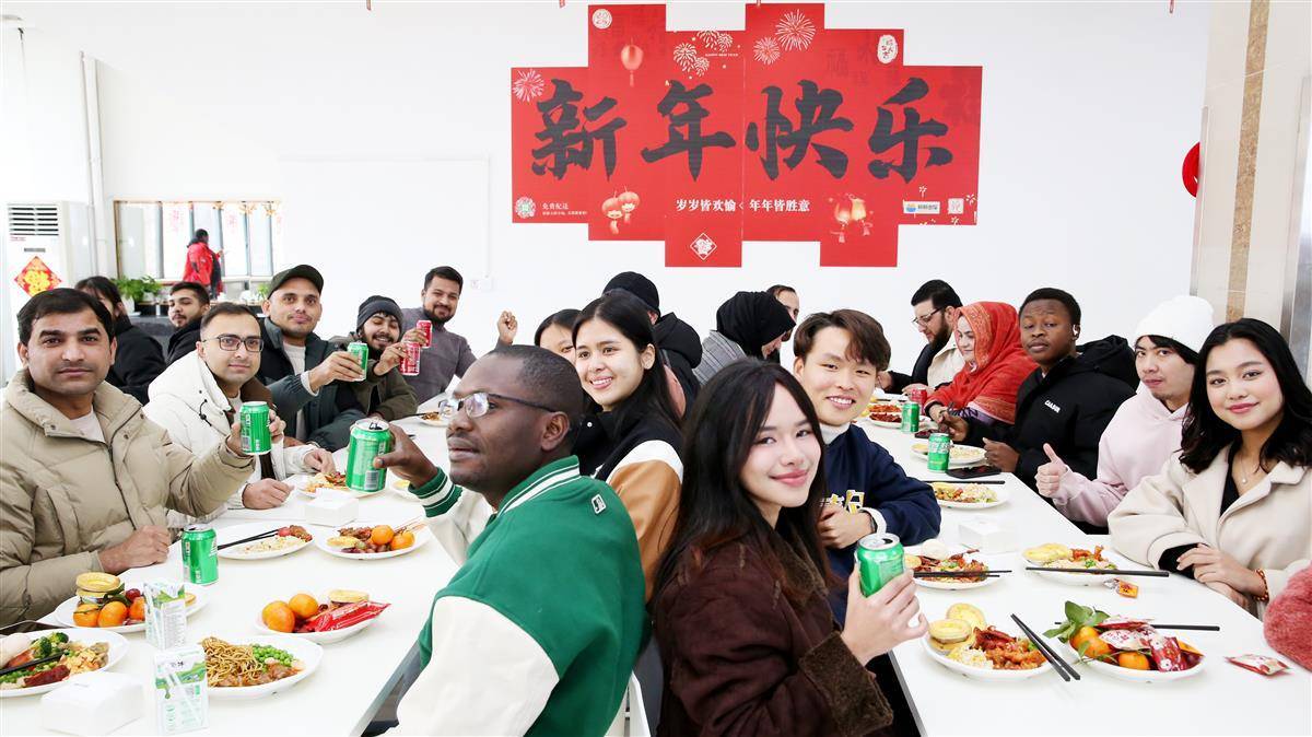 1月26日农历腊月27,中国地质大学(武汉)丝绸之路学院来自保加利亚、老挝、泰国、巴基斯坦、越南等40多个“一带一路”国家的358名来华留学生欢聚一堂,品尝丰盛的团年饭,开心笑语欢度“中国年”。