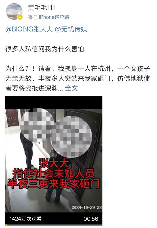 近日,昵称为@黄毛毛111的女网友在社交媒体自曝称“被拥有6000万粉的男艺人张大大辱骂殴打”。1月26日凌晨,张大大签约MCN无忧传媒发表声明:近日,关于“我司员工被艺人霸凌”一事,公司在事件发生第一时间已成立专项小组,着手处理此事。此事在网上引发热议,张大大到底有没有动手打人?@黄毛毛111所发布的视频中,半夜砸门的“未知社会人员”到底是谁?当事员工是否遭威胁解约?1月26日,极目新闻记者就此联系上无忧传媒相关负责人,对方进一步回应了此事。