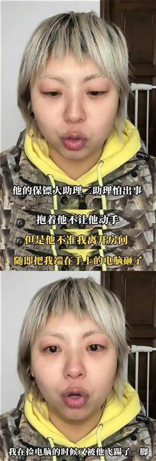 此前,昵称为@黄毛毛111的女网友唐女士自述称,2024年10月27日,因脚本沟通不畅,男艺人在酒店对她展开了长达两小时的“残忍折磨”。其间,该男艺人在酒店用枕头、茶几、玻璃杯砸她。男艺人不仅将她电脑砸毁,还在她捡电脑的时候又飞踢了她一脚。唐女士还放出了一段音频来佐证,该音频中一男性粗鄙言语频出,甚至说出“我的话就是圣旨”一恶劣言论。1月25日,唐女士在相关博文中@了男艺人张大大。