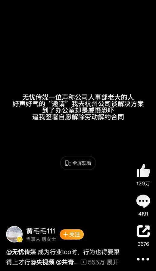 极目新闻记者注意到,唐女士还发布了一条她与自称无忧传媒人事部主管的对话录音,称对方逼迫她签署自愿解除劳动解约合同。她在视频里说:“我被张大大打了,不给我任何一个解决渠道,然后就是开除我呗。”据她对录音的说明,该公司的人试图阻止她录像,并有拉扯行为。