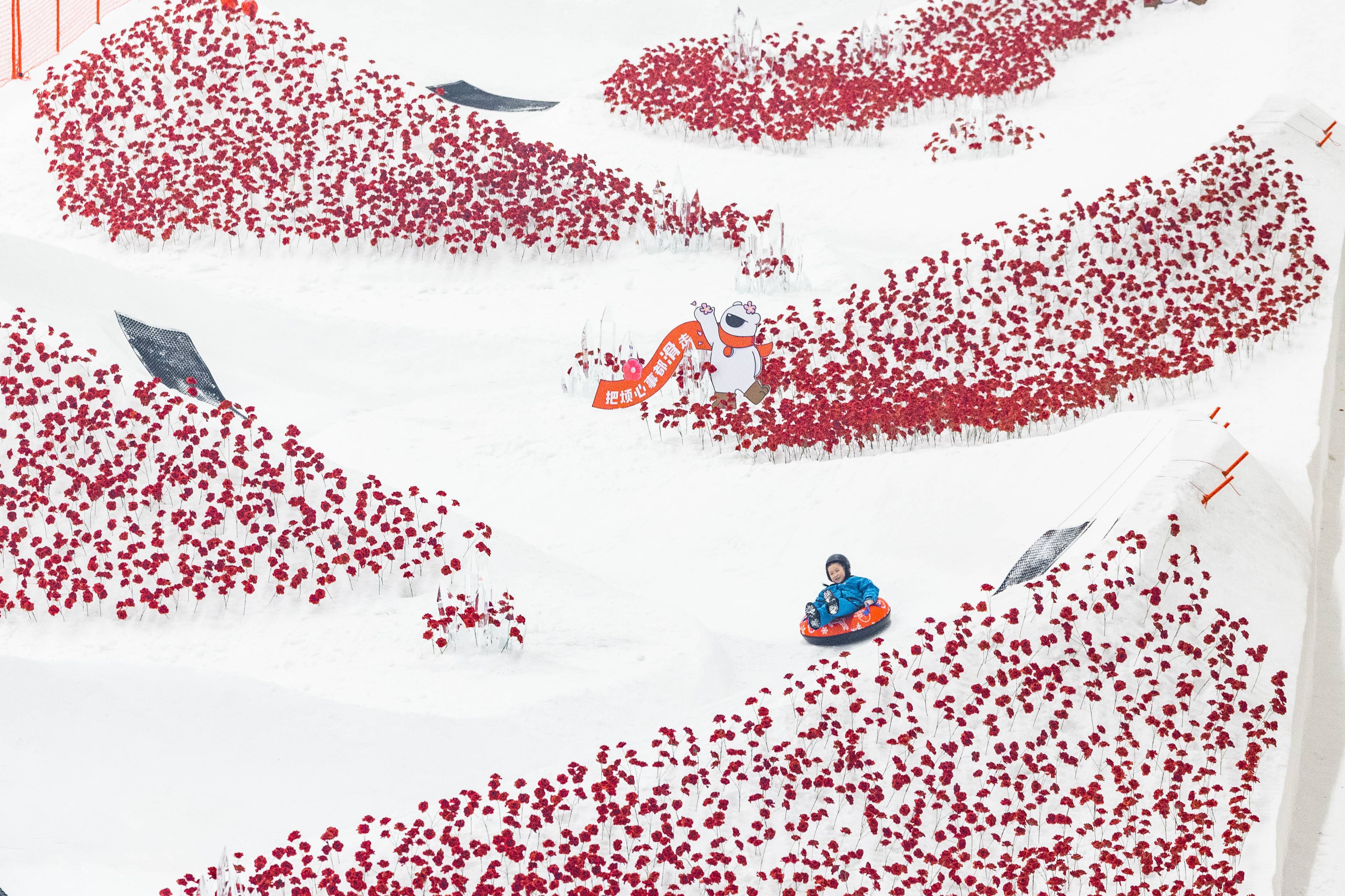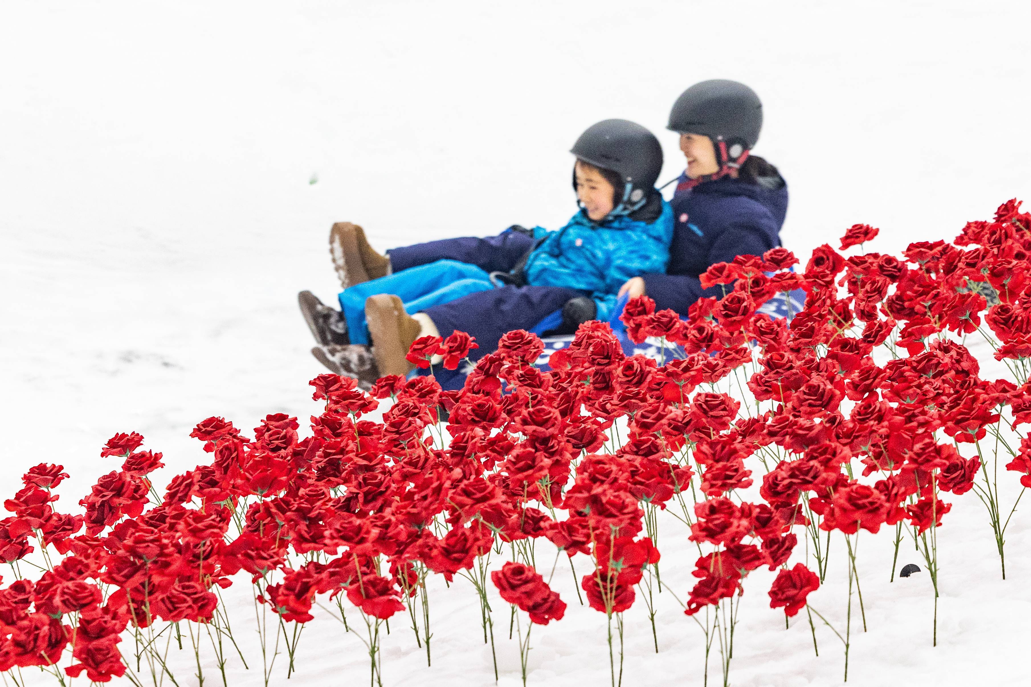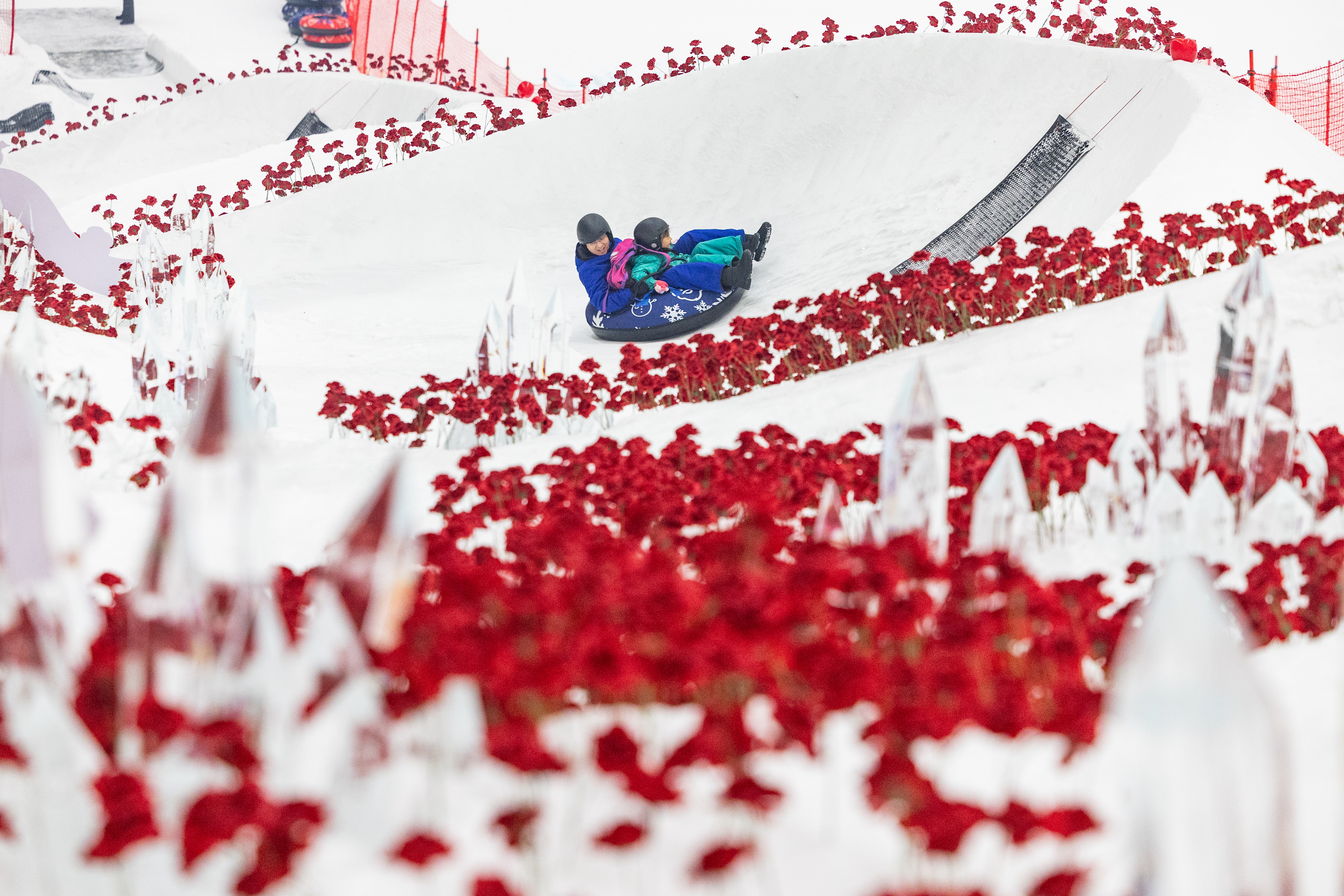 2025年1月26日,武汉市黄陂区甘露山国际滑雪场热闹非凡,娱雪区内百米的雪圈道铺满了红色的玫瑰花,游客们从高处滑下,在白茫茫的雪道上从满坡红彤彤的花丛中经过,既惊险刺激又感受到浓厚的新年氛围。