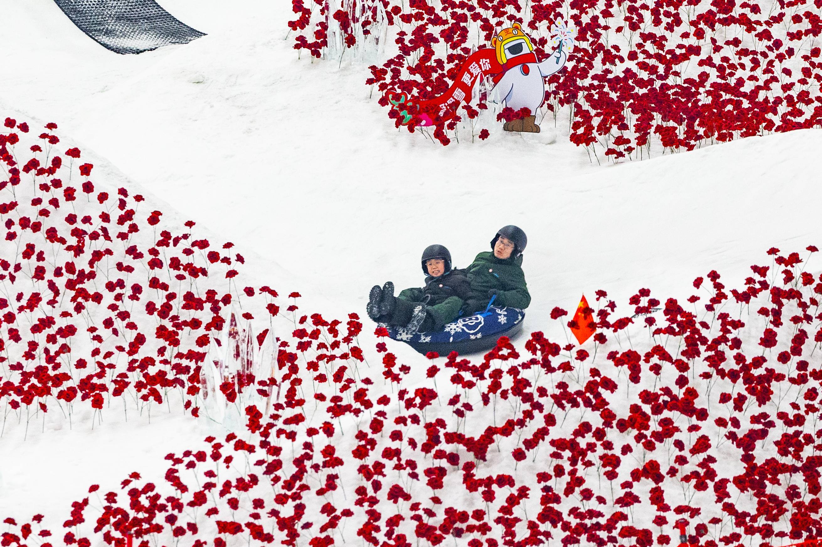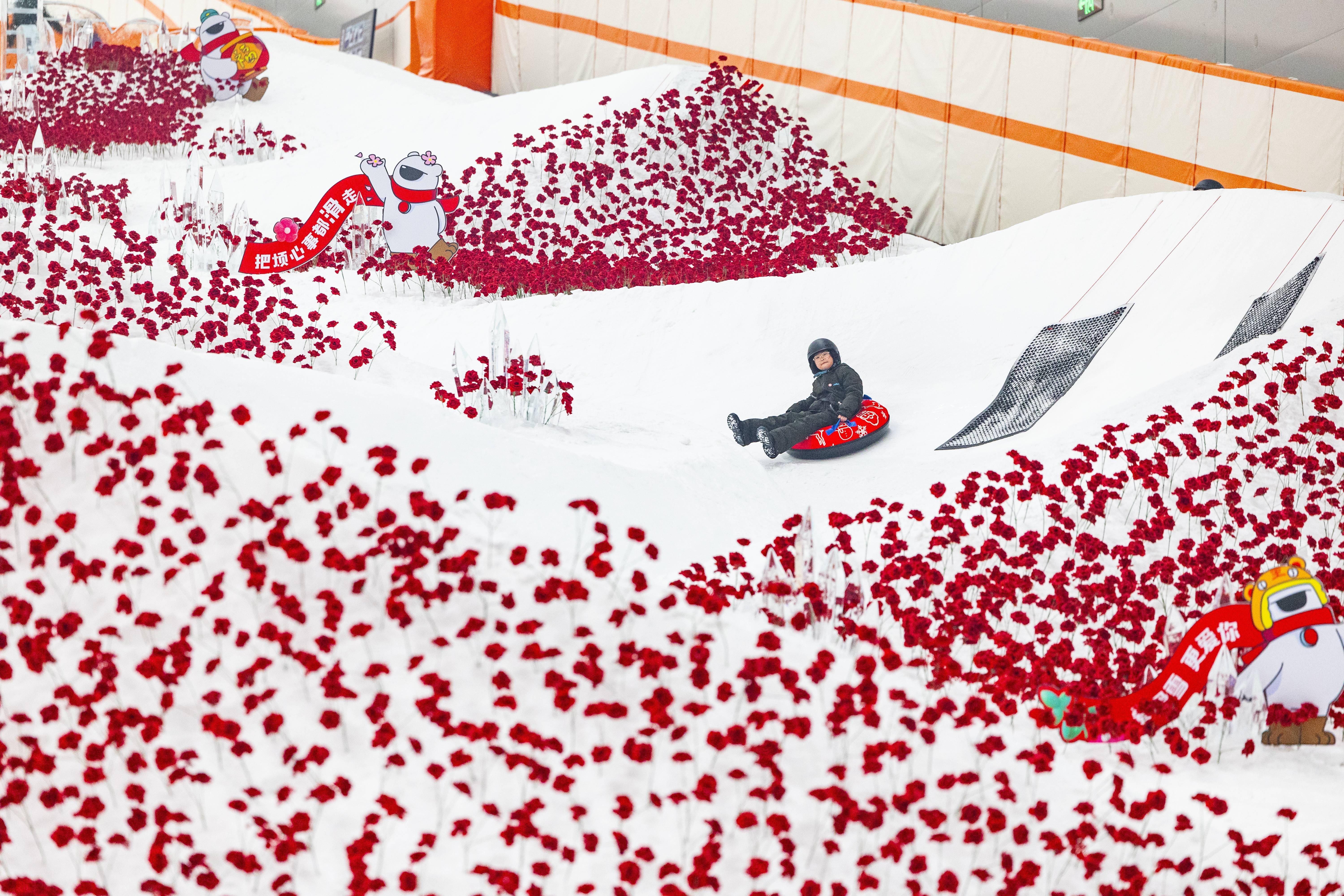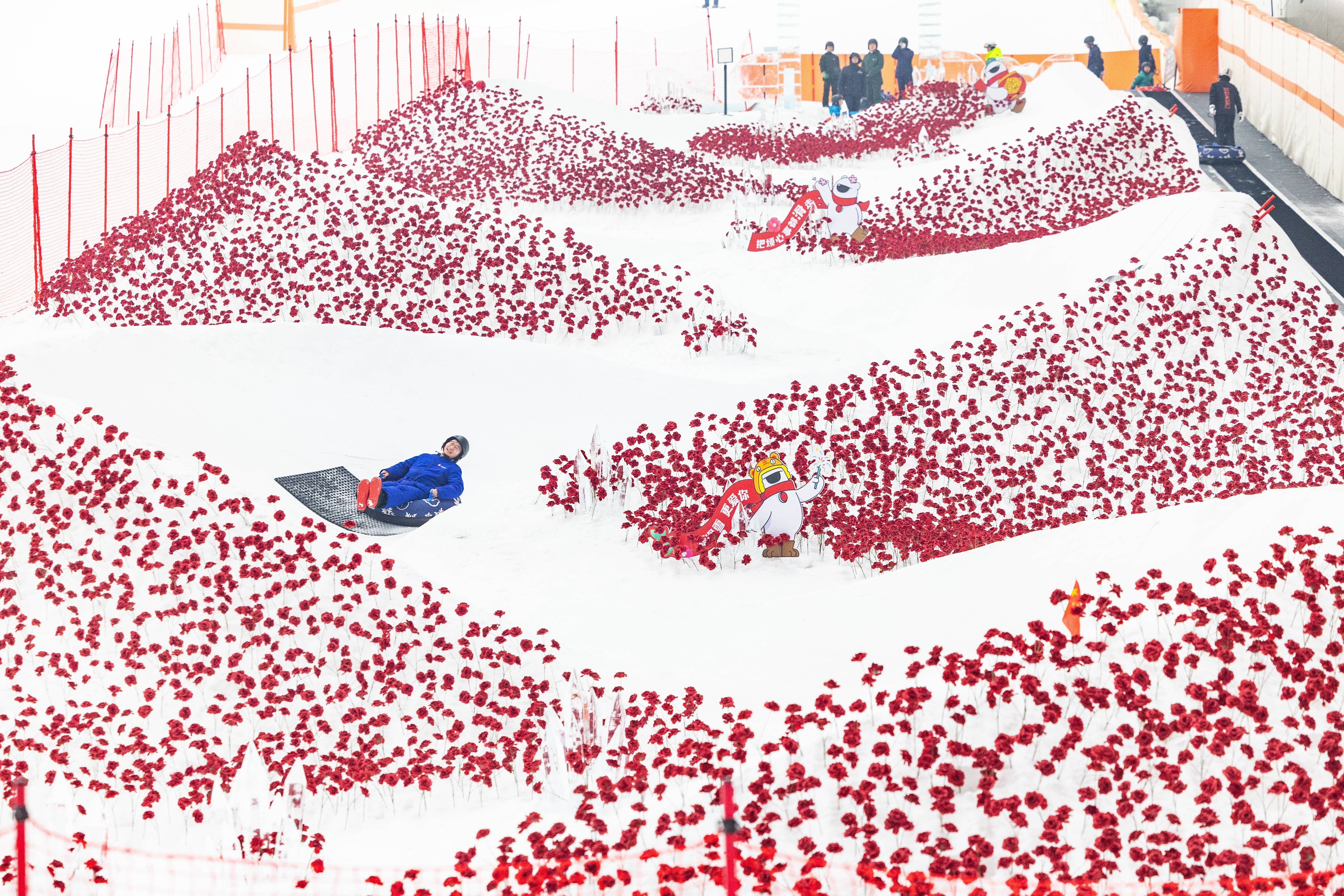 2025年1月26日,武汉市黄陂区甘露山国际滑雪场热闹非凡,娱雪区内百米的雪圈道铺满了红色的玫瑰花,游客们从高处滑下,在白茫茫的雪道上从满坡红彤彤的花丛中经过,既惊险刺激又感受到浓厚的新年氛围。