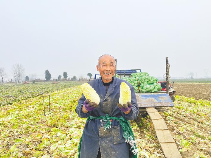 一月二十三日,六十五岁的王集镇菜农章宜群脸上洋溢着丰收的喜悦。 (湖北日报通讯员 邬玲玲 摄)