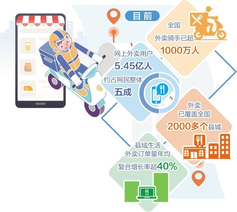 如今,外卖已成为人们日常生活中不可或缺的一部分。中国互联网络信息中心数据显示,我国网上外卖用户规模已达5.45亿人,约占网民整体的五成。在大城市出现一定程度饱和趋势同时,县域生活外卖订单量年均复合增长率超40%。在优化城市存量市场结构同时,向强劲增长的县域外卖市场“下沉”潜力巨大,外卖已覆盖全国2000多个县城。