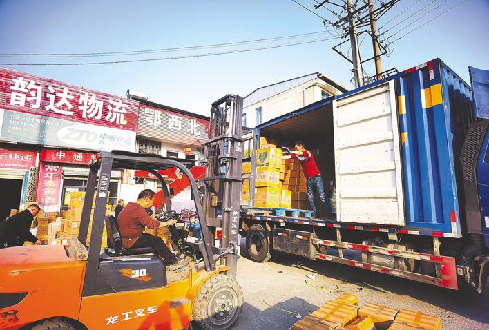 1月23日,农历腊月廿四,南方小年。位于房县城关镇晓阳村的永安物流有限公司一片繁忙景象,院子里堆满了等待发货的黄酒。只见叉车来回穿梭,把一箱箱黄酒送上大货车,发往全国各地。