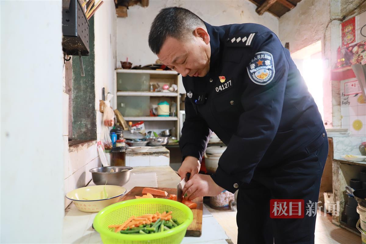 为了把年饭准备妥当,朱万春一大早便来到菜市场,精心挑选鲜美食材,然后带着辅警周芳和张涛来到黄花涝村驻村辅警王雄飞的家中。一行人立刻化身为大厨,纷纷施展“十八般”厨艺。把蔬果清洗干净,葱姜切成小段,处理好炖汤的鸡鸭,又细细剁出肉馅,朱万春等人在厨房里忙得不亦乐乎,年味很快弥漫了整个小院。