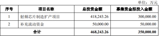 卓胜微首次公开发行股票募集资金总额为88,225.00万元,扣除发行费用后募集资金净额82,885.74万元。卓胜微于2019年6月3日披露的招股说明书显示,该公司拟募集资金82,885.74万元按,分别用于射频滤波器芯片及模组研发及产业化项目、射频功率放大器芯片及模组研发及产业化项目、射频开关和LNA技术升级及产业化项目、面向IoT方向的ConnectivityMCU研发及产业化项目、研发中心建设项目。