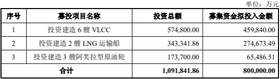 本次向特定对象发行股票募集资金总额不超过800,000.00万元(含本数),在扣除相关发行费用后的募集资金净额将投资于如下项目:投资建造6艘VLCC、投资建造2艘LNG运输船、投资建造3艘阿芙拉型原油轮。