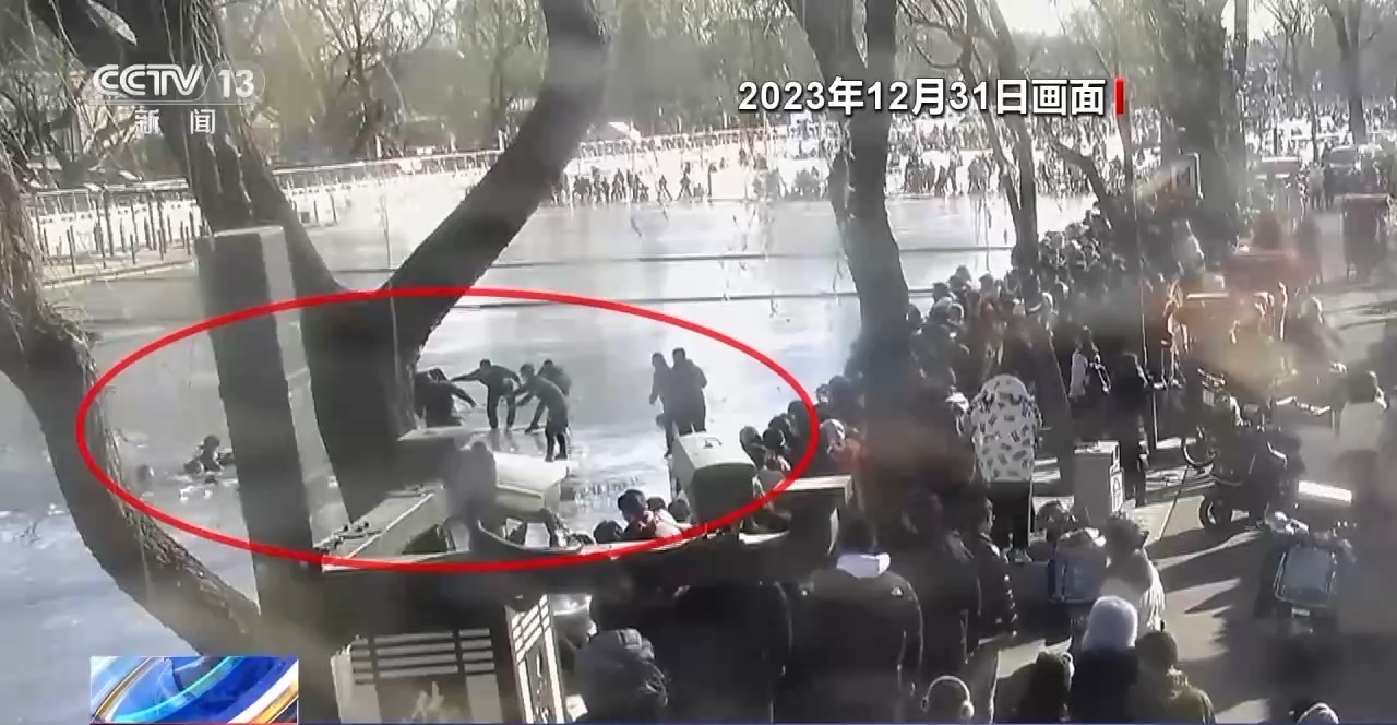 民警黄鑫对每一次测量冰层厚度都尤其重视,因为他曾亲身经历过一次惊险的救援。2023年12月31日,在什刹海景区,一名男孩儿意外跑到非开放区域的冰面上,男孩的家长在身后追赶,因为冰面较薄,两人先后掉入水中。