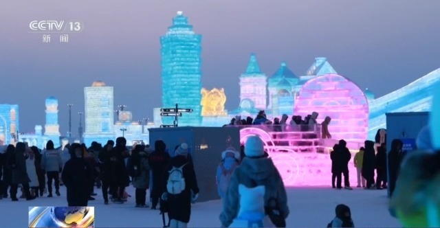 游客们的求助被执勤民警一一解决,哈尔滨冰雪大世界的冰雕也随着落日都亮起了灯,整个园区被五彩斑斓的灯光照亮,宛若一个童话世界。