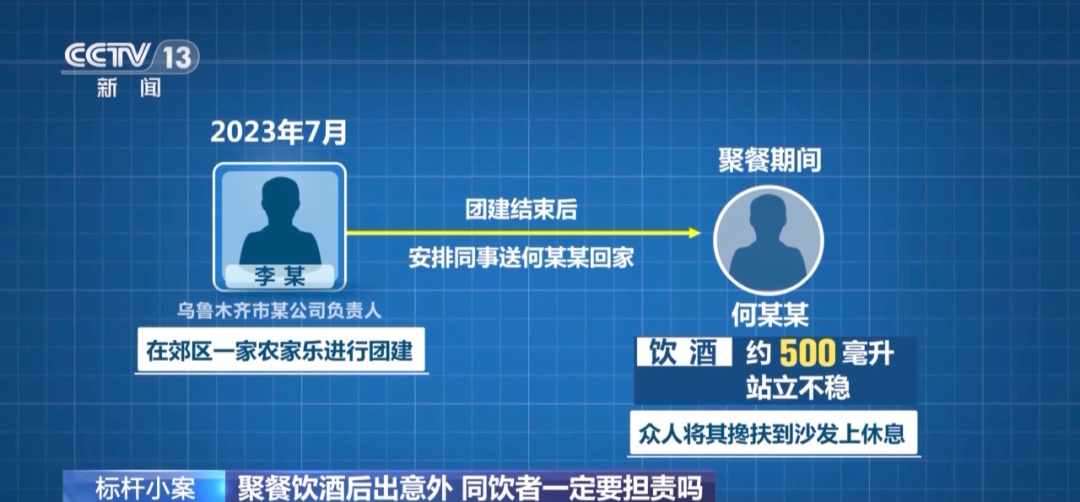 2023年7月,乌鲁木齐市某公司负责人李某组织员工在郊区一家农家乐进行团建。聚餐期间,何某某饮酒约500毫升,继而站立不稳,众人将其搀扶到沙发上休息。团建结束后,李某安排同事送何某某回家。