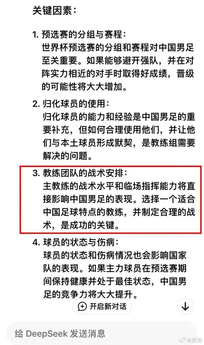 有足球媒体人问DeepSeek:“中国队能打进2026年世界杯吗?”系统给出了4点关键因素。