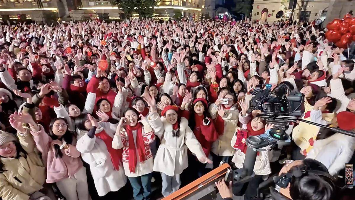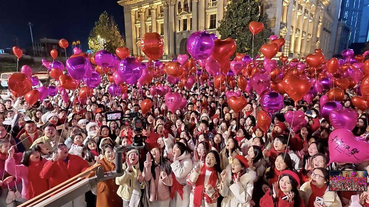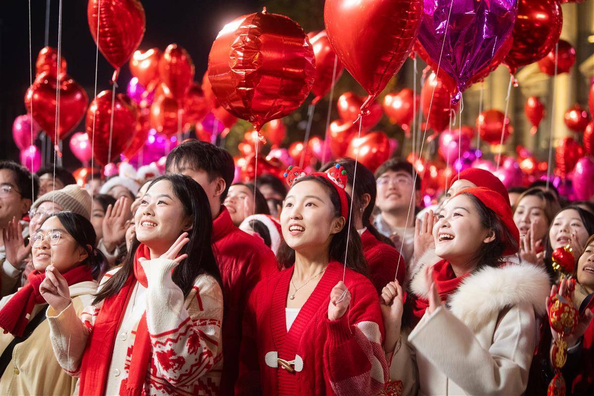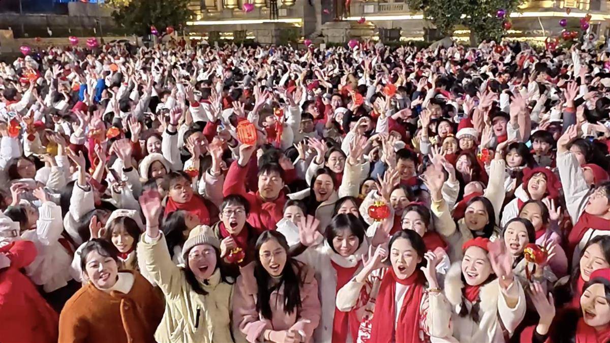 2025年1月13日凌晨,数百名参加中央广播电视总台《2025年春节联欢晚会》武汉分会场节目短片录制的学生演员们在江汉关前拍摄蛇年钟声敲响放飞气球片段。